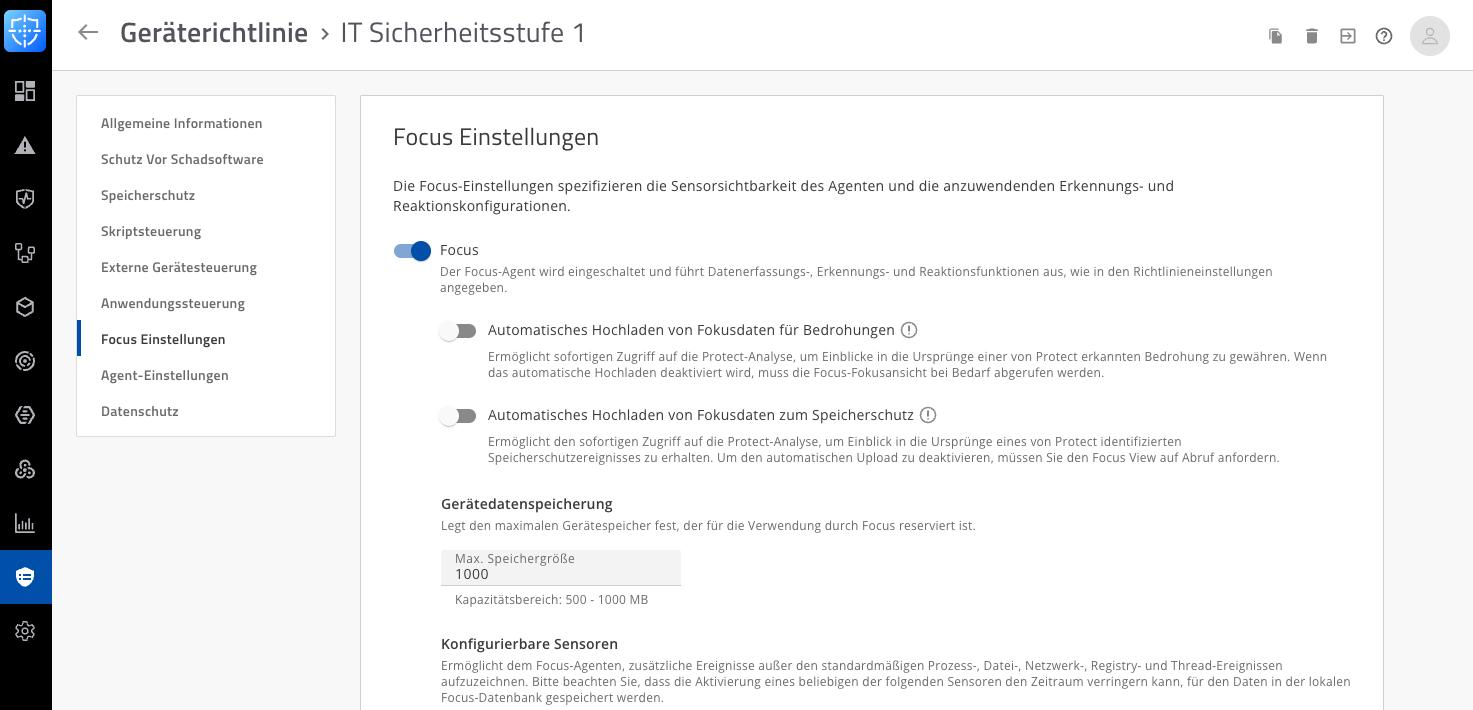 Die Focus-Einstellungen bestimmen, wie sichtbar der Agent ist und welche Erkennungs- und Reaktionsmaßnahmen aktiv sind. Wenn aktiviert, sammelt der Focus-Agent kontinuierlich Daten und führt konfigurierbare Analysen durch. Das automatische Hochladen von Focus-Daten bei Bedrohungen oder Speicherschutzereignissen ermöglicht sofortigen Zugriff auf tiefergehende Analysen in der Protect-Konsole. Alternativ kann der Datenabruf manuell erfolgen. Der Speicherbereich für Daten beträgt 500 bis 1000 MB.