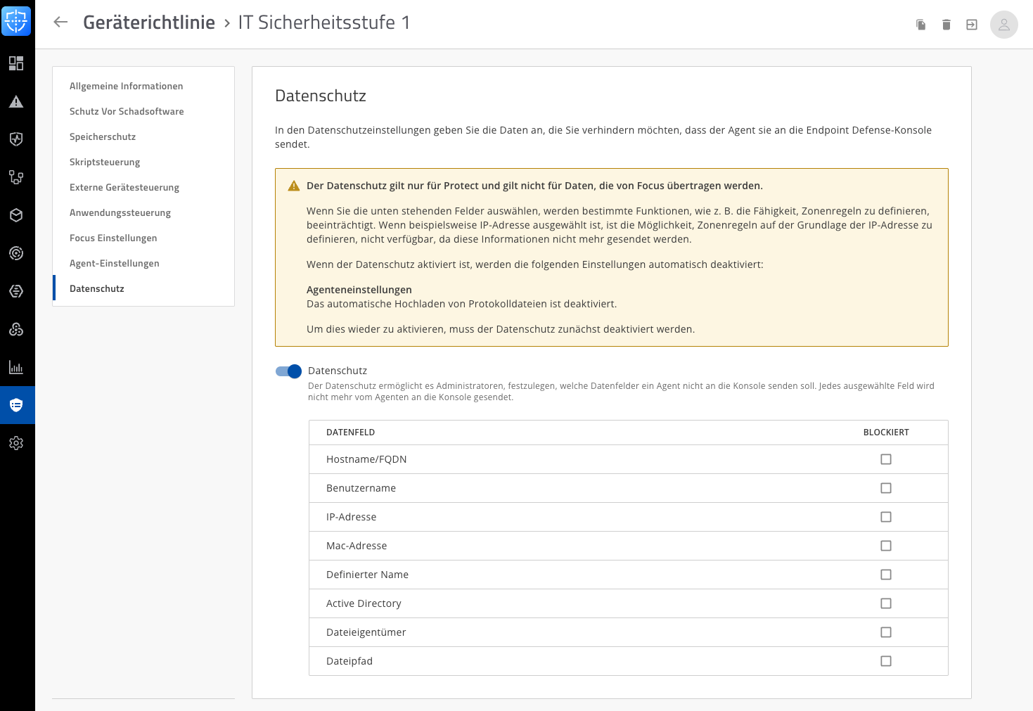Die Einstellung Data Privacy innerhalb der Device Policy ermöglicht es Administratoren festzulegen, welche Datenfelder vom Agenten nicht an die Konsole gesendet werden sollen. Sobald ein bestimmtes Feld deaktiviert ist, wird dieser Informationsbereich nicht mehr erfasst oder übertragen. Dadurch lässt sich der Datenschutz erhöhen und die Datenerhebung gezielt einschränken – etwa bei besonders sensiblen Informationen wie Benutzernamen, Computername oder installierte Anwendungen.