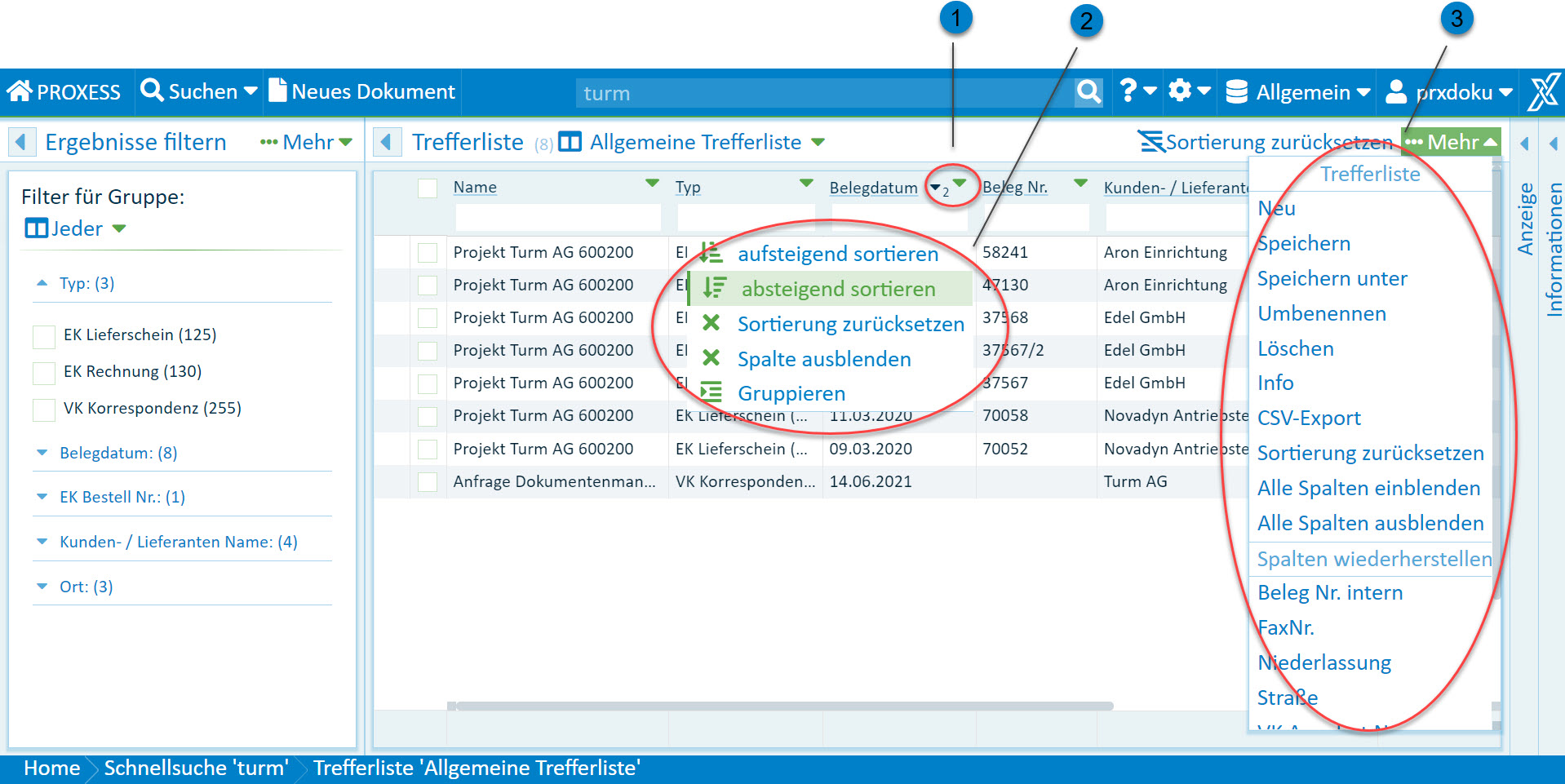 Spalten, die für Ihren Arbeitsbereich uninteressant sind, können Sie in den Spaltenoptionen ausblenden. So wird die Trefferliste schlanker und übersichtlicher.
