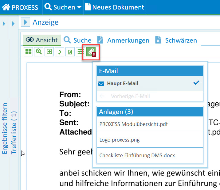 Beim Versenden der E-Mail mit PROXESS werden automatisch alle Anlagen zur Versendung vorgeschlagen und können übernommen werden.