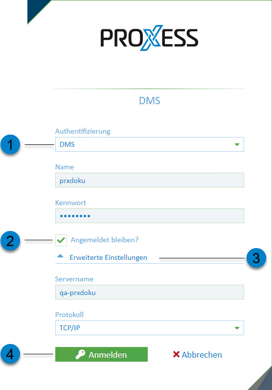 Wählen Sie Authentifizierung DMS wenn Sie sich mit einem Proxess User anmelden, oder Windows falls Sie sich mit einem Windows User anmelden.
