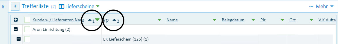 Um mehrere Spalten zu sortieren, halten sie ebenfalls die SHIFT-Taste gedrückt und klicken mit der Maus die Spaltentitel in der gewünschten Reihenfolge an.