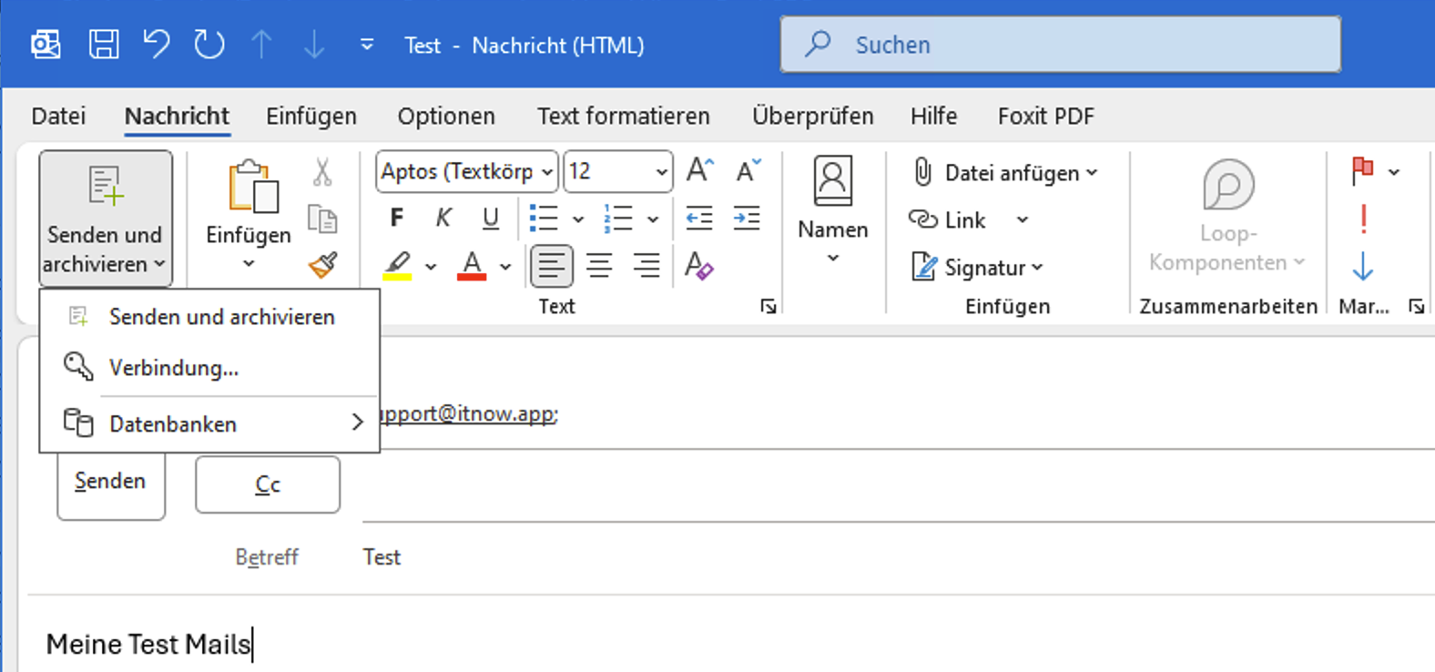 Falls Sie eine Ausgehende Mail Archiveren möchten können Sie bei der erstellten Mail oben jetzt auf Senden und Archivieren klicken. Dort öffnet sich dann ein Fenster