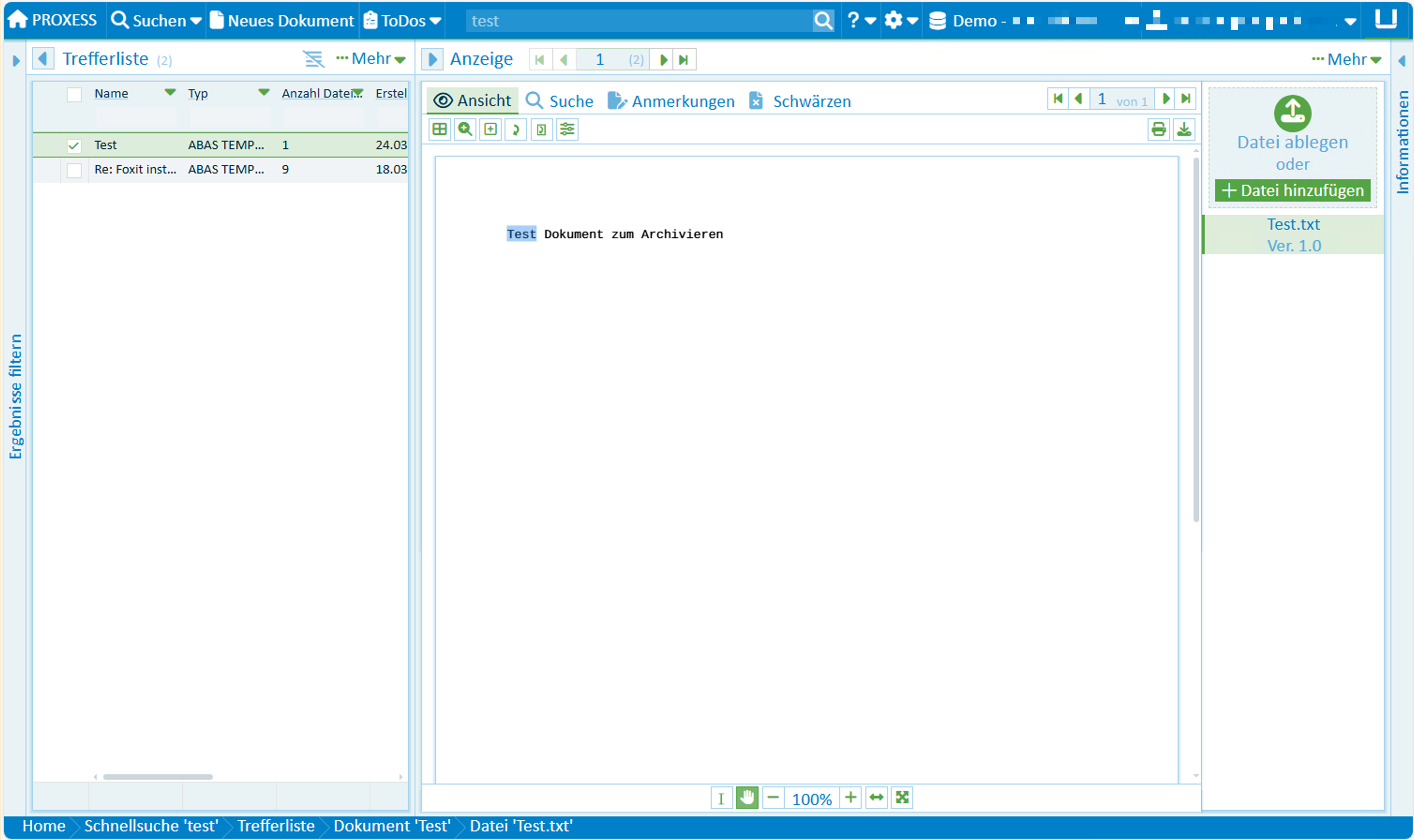 Sucht man jetzt über die Schnellsuche im Proxess Webclient nach dem Dokument wird es direkt angezeigt.