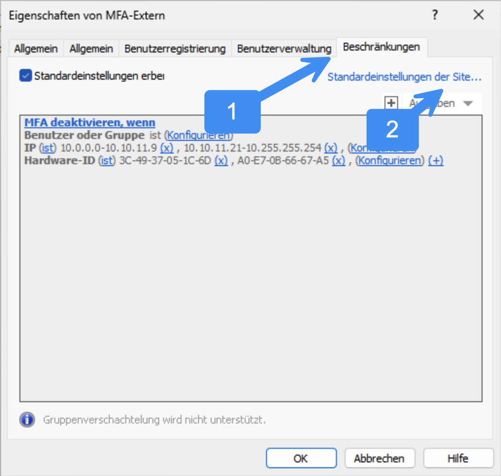 Jetzt klickt man auf 1. Beschränkungen und 2.Standardeinstellungen der Site