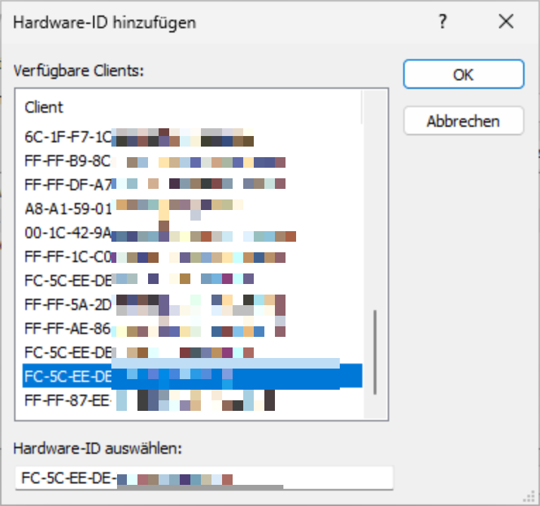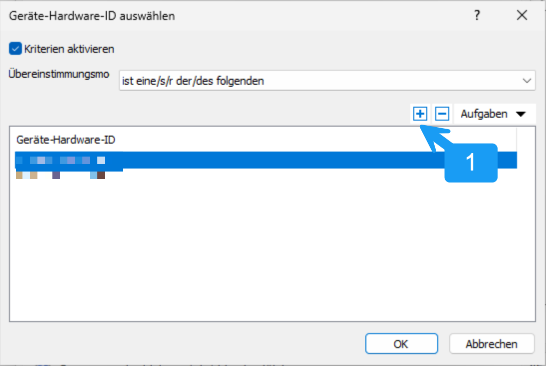 Jetzt sieht man ein Fenster mit den Freigegeben Hardware-IDs klickt auf 1. + Hinzufügen