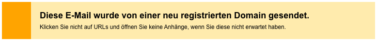 Ein Hinweis wird angezeigt, wenn eine E-Mail von einer Domain (z.B. beispiel.com) kommt, die vor weniger als 6 Monaten erst registriert wurde.